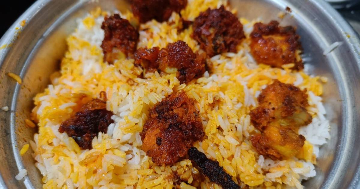 Spicy chicken fry pieces layered with aromatic basmati rice for a bold and flavorful biryani.